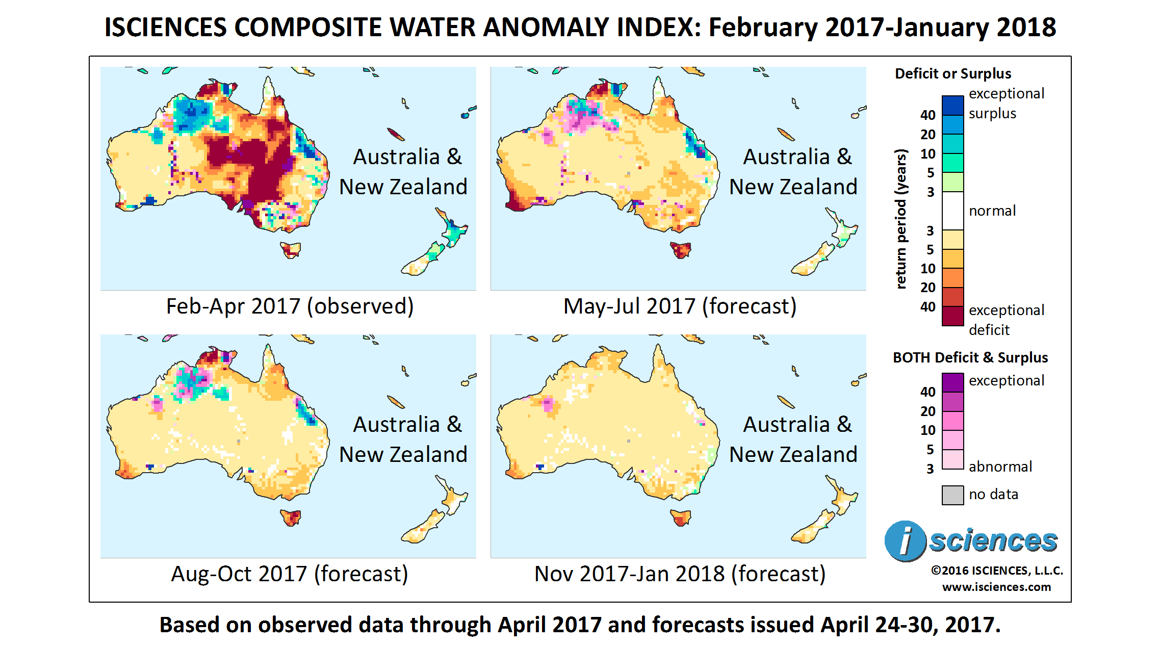 As is apparent in the map series, the forecast indicates that Australia will transition away from widespread and intense water deficits observed February through April. However, severe to exceptional deficits are forecast May through July and longer in southwestern Western Australia, the Darwin Region of Northern Territory, and Tasmania. Moderate deficits with pockets of severe to extreme deficits are forecast for New South Wales, Victoria, much of the Cape York Peninsula in northern Queensland, and New Caledonia.