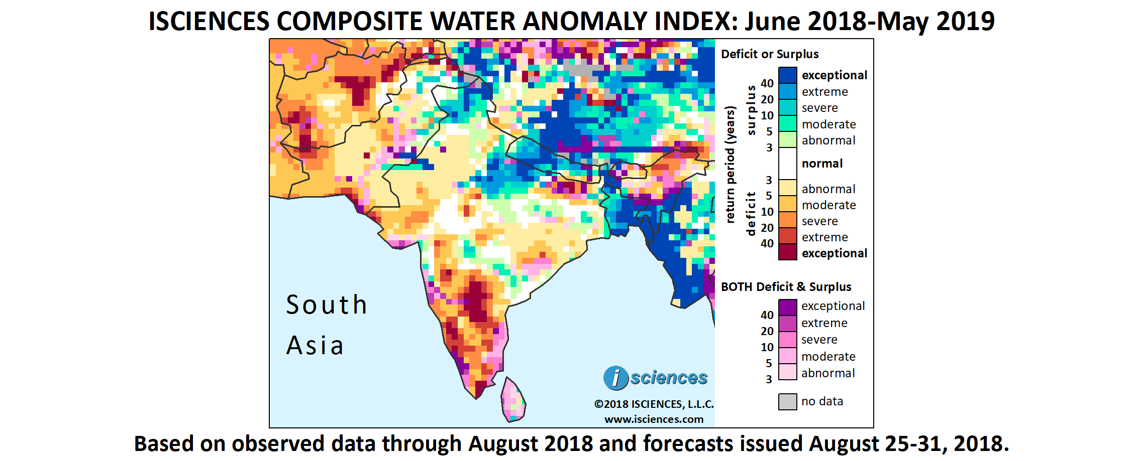 The 12-month forecast through April 2019 indicates intense water deficits in southern India, in Afghanistan’s northern half, and in southwestern Afghanistan reaching into Pakistan. Deficits are also expected to be intense near Karachi, Pakistan.