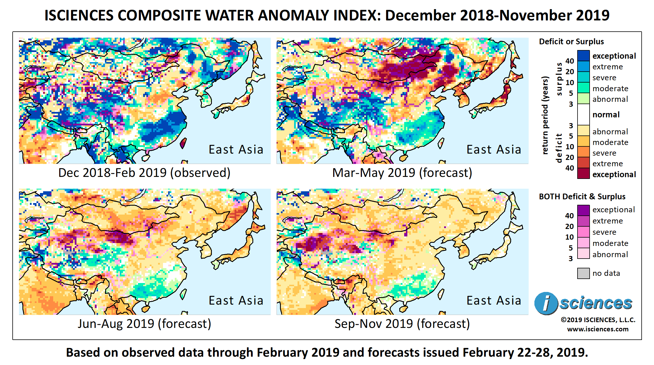 The forecast through May indicates the emergence of a vast stretch of extreme to exceptional water deficits in southern and eastern Mongolia and into Inner Mongolia, China, interspersed with conditions of both deficit and surplus as transitions occur. Deficits will increase and intensify in western Jilin and western Liaoning to the Bohai Sea, becoming exceptional. Moderate to severe deficits will form a broad path from Beijing through Shanxi and Shaanxi into eastern Sichuan. Conditions of both deficit and surplus (purple) are forecast on the Ordos Loop of the Yellow River as transitions occur.