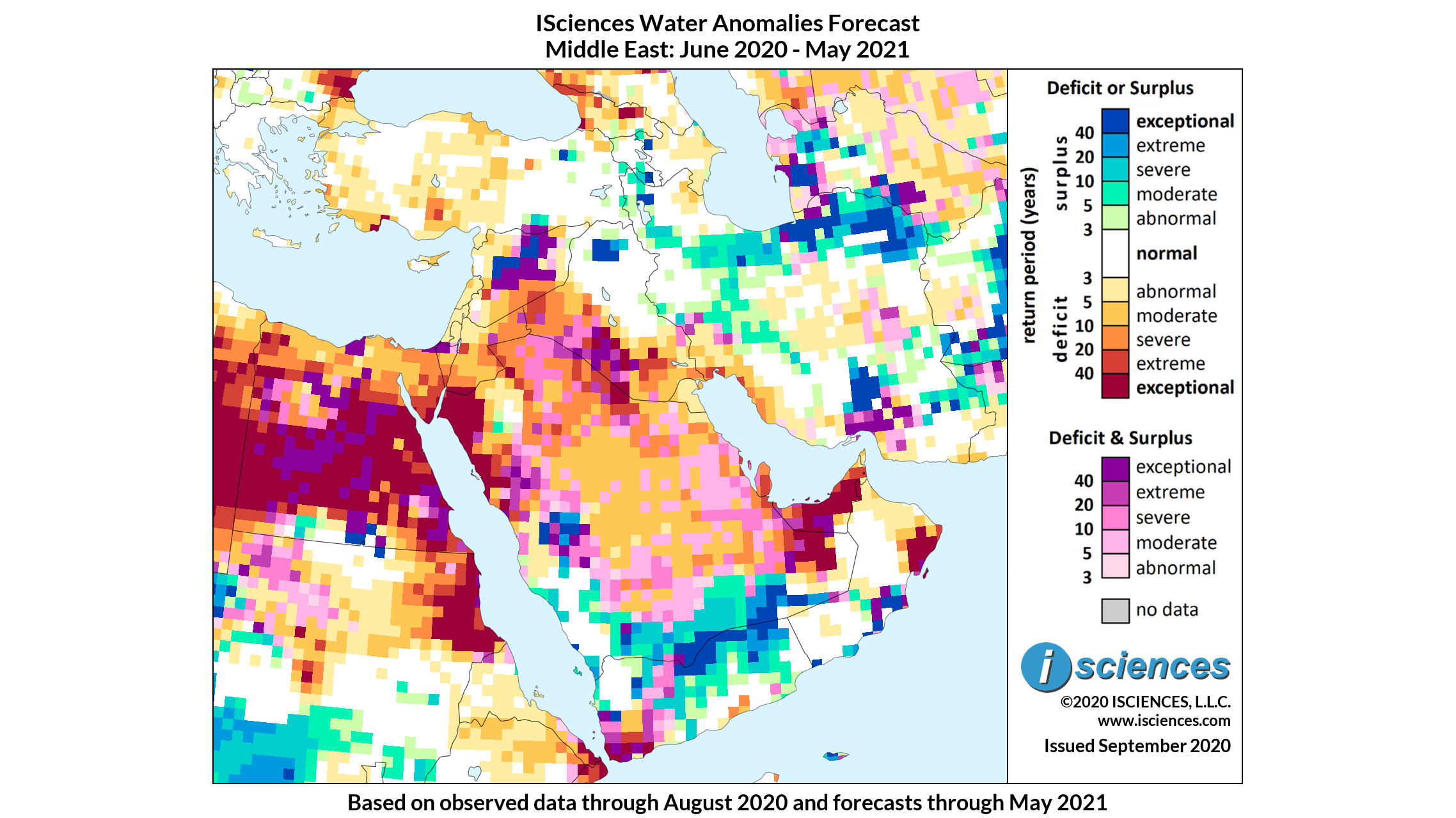 The forecast for the 12-month period ending May 2021 indicates water deficits from southern Syria through Jordan and much of Iraq west of the Euphrates River, and well into Saudi Arabia, Oman, and the United Arab Emirates. Deficits will be exceptional in Saudi Arabia along the northern Red Sea and in the United Arab Emirates. Areas of both deficit and surplus are also forecast (pink/purple) as transitions occur in western Iraq and pockets of Saudi Arabia.