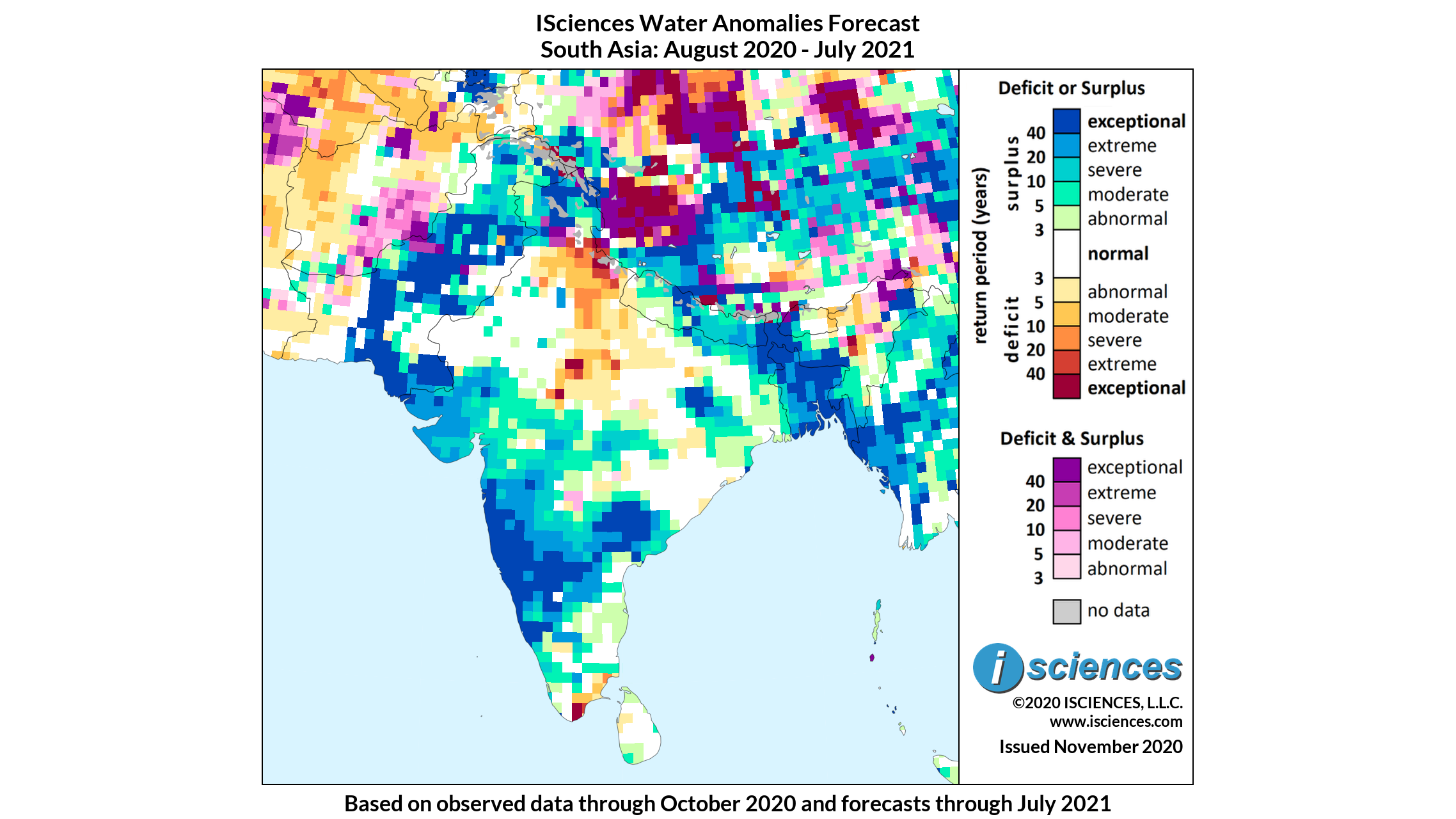 The 12-month forecast through July 2021 indicates widespread, water surpluses in many regions of India and in Bangladesh, Nepal, and Pakistan.