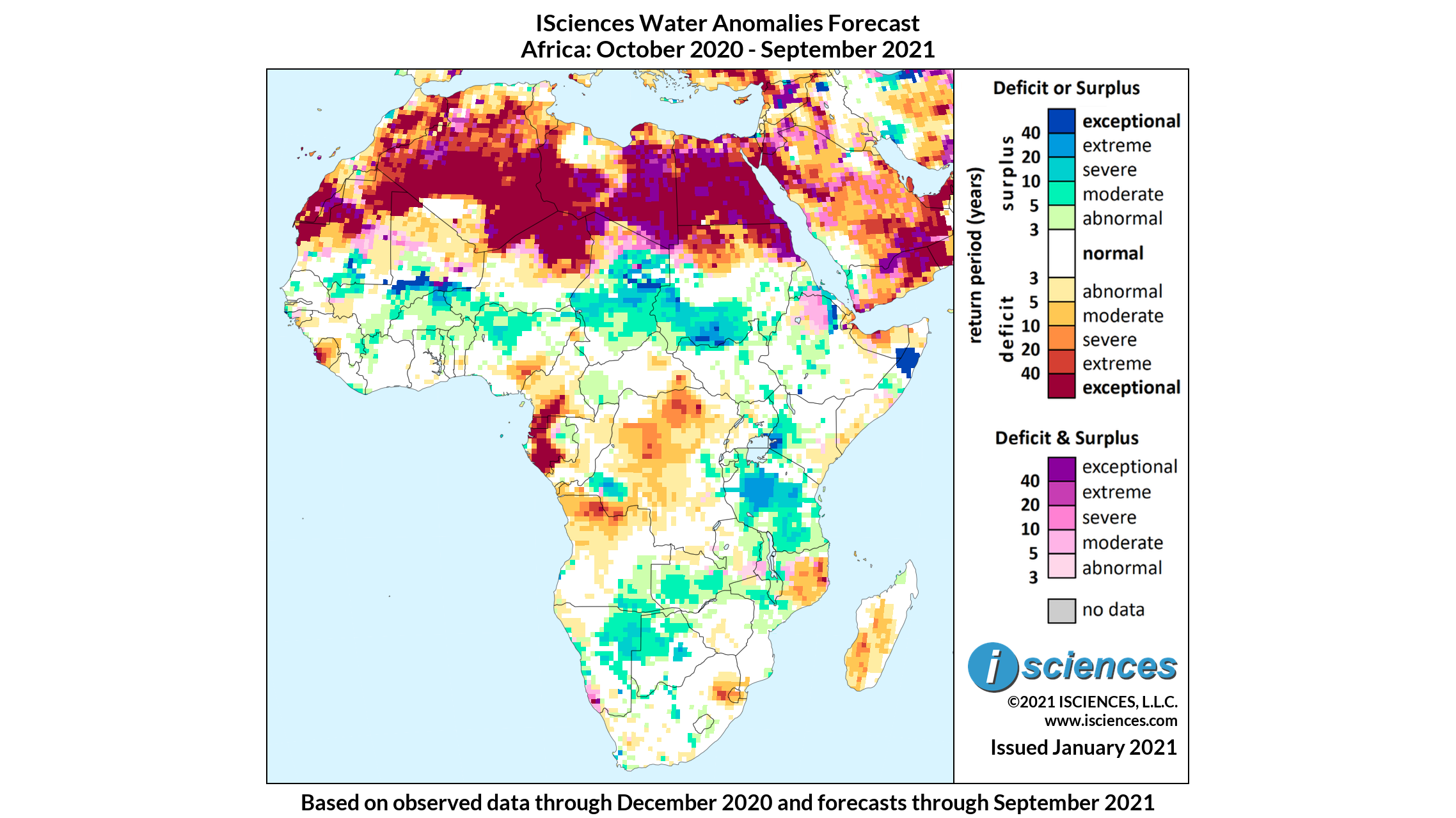 The 12-month forecast through September 2021 indicates intense water deficits across North Africa including widespread exceptional anomalies. Pockets of mixed conditions are also forecast (pink/purple).