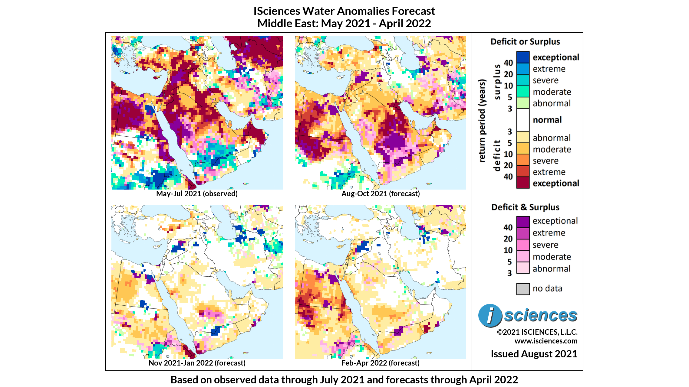 The forecast for the 12-month period ending April 2022 indicates water deficits in much of Turkey, throughout the Levant, and many regions in the Arabian Peninsula.