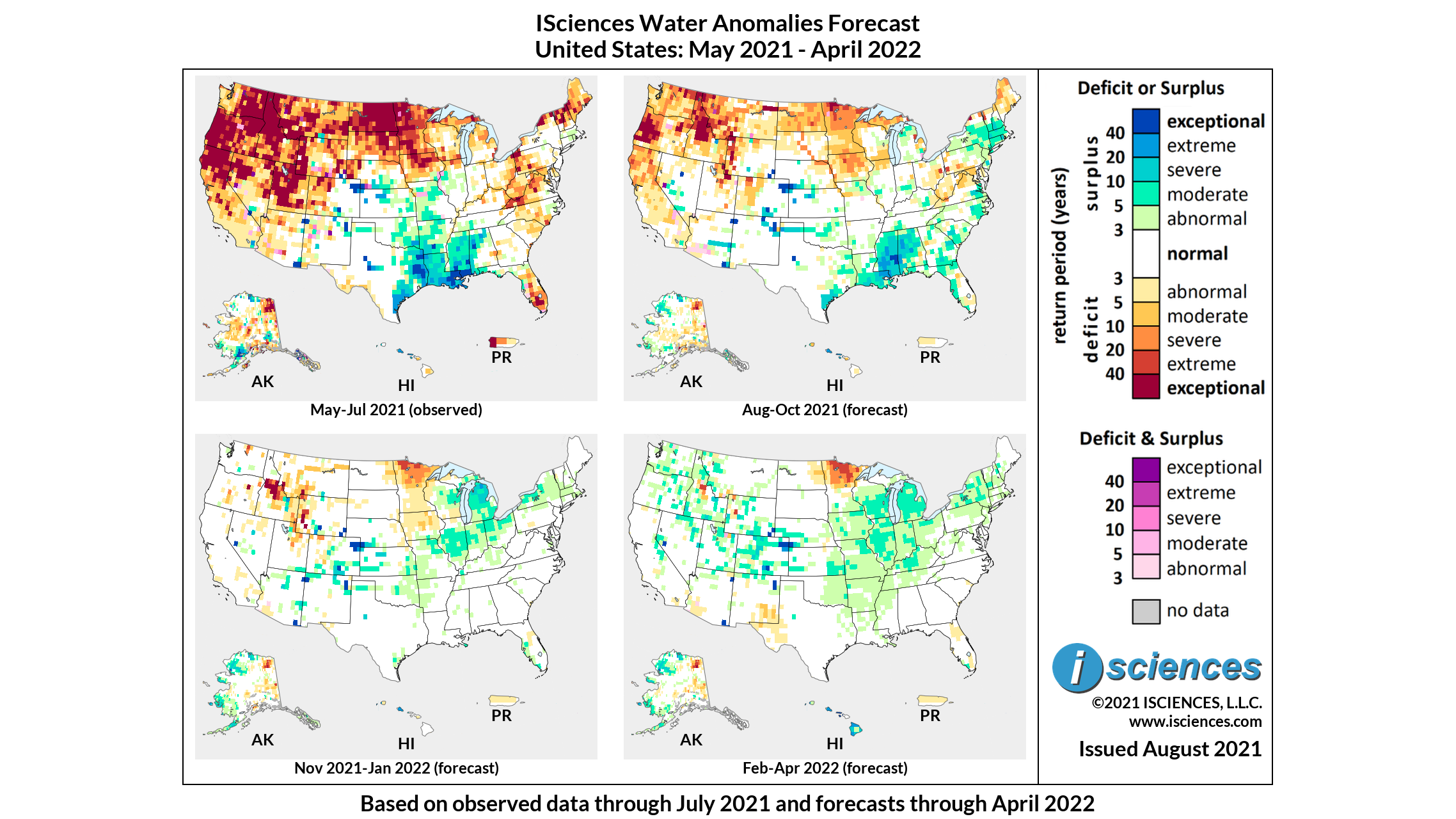 The forecast for the final months – February through April 2022 – indicates persistent deficits in Minnesota and emerging deficits in southeastern New Mexico. Surpluses are forecast in the Great Lakes region and beyond, and in pockets from the Pacific Northwest through the Rockies and Central Plains.