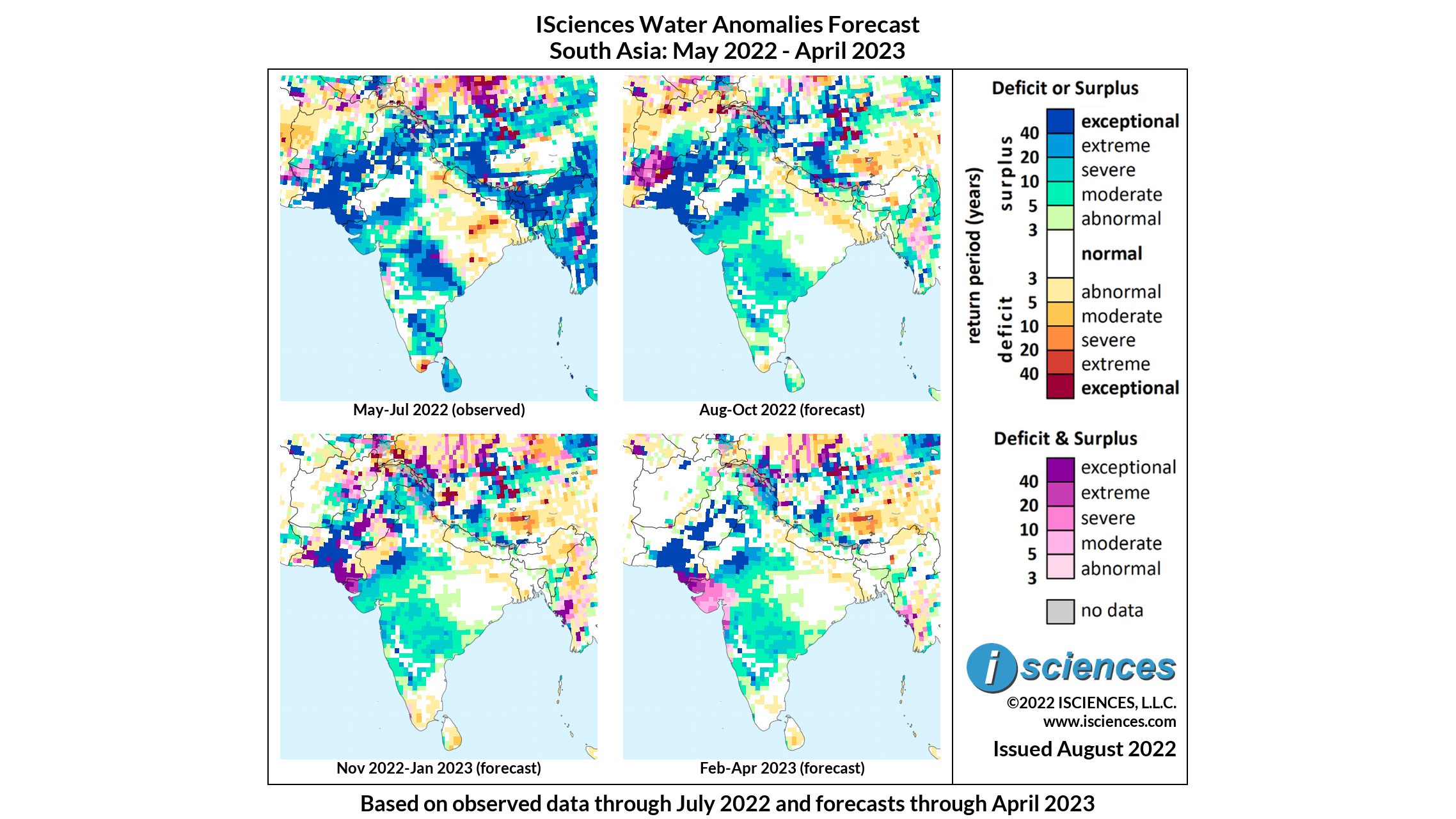 In Nepal, surpluses of varying intensity are forecast throughout the Himalayas; some moderate deficits will skirt the Indian border. Bhutan will also see surpluses as will much of Bangladesh’s northern half, and surpluses will trace the path of the Padma River as it joins the Meghna to the Bay of Bengal. Moderate deficits are expected in the Ganges Delta.