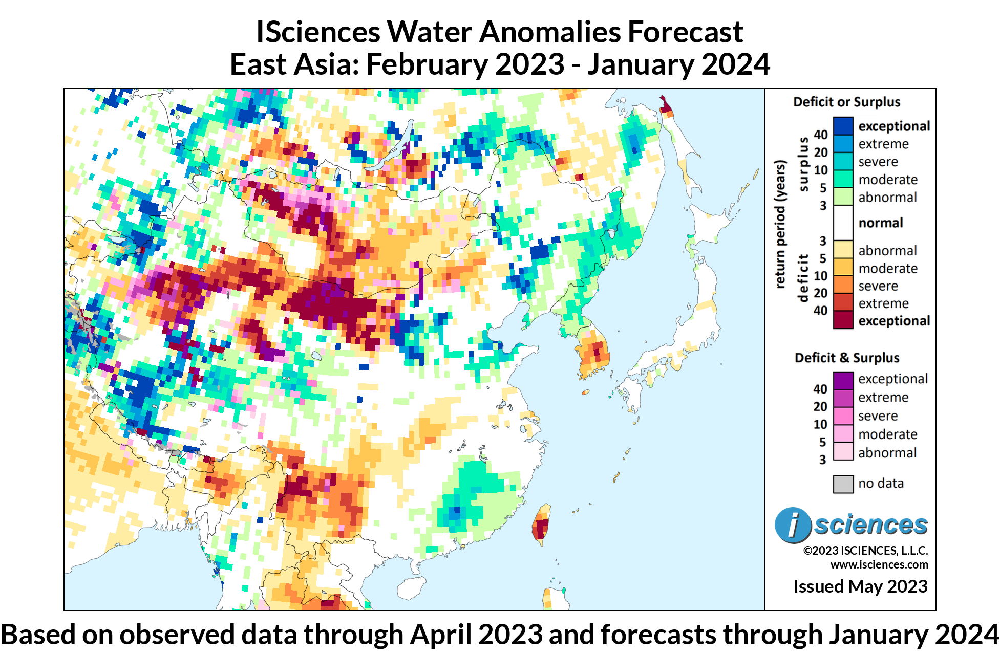 The forecast through July 2023 anticipates intense surpluses in central Inner Mongolia to persist, as well as in regions of the Liaoning, Jilin, and Heilongjiang provinces. Deficits in western Inner Mongolia are expected to mostly dissipate, becoming moderate deficits in most areas of the region. Extreme to exceptional surpluses will persist throughout Tibet, as well as in western Xinjiang. Further south, northern regions of Yunnan can expect exceptional deficits. In South Korea, extreme deficits are expected to continue.