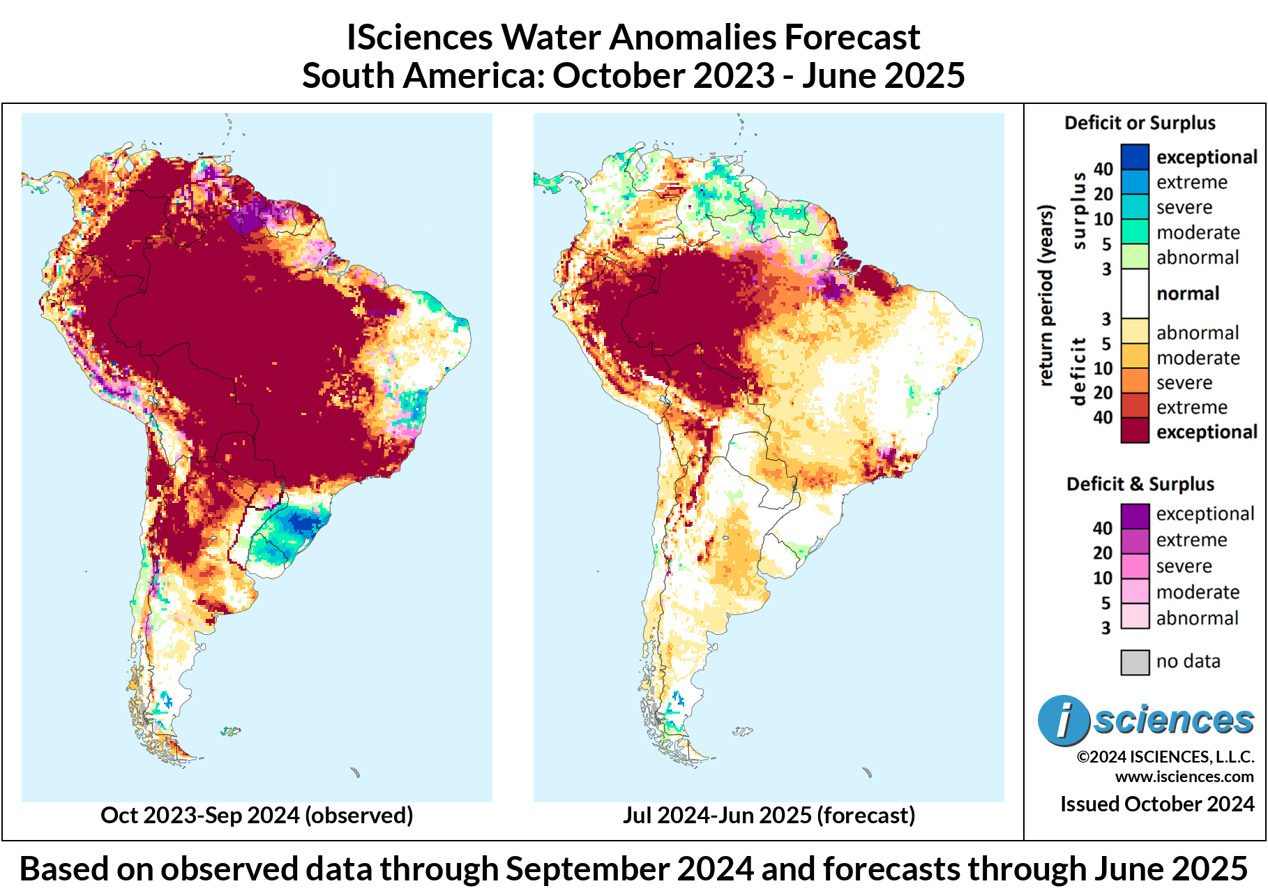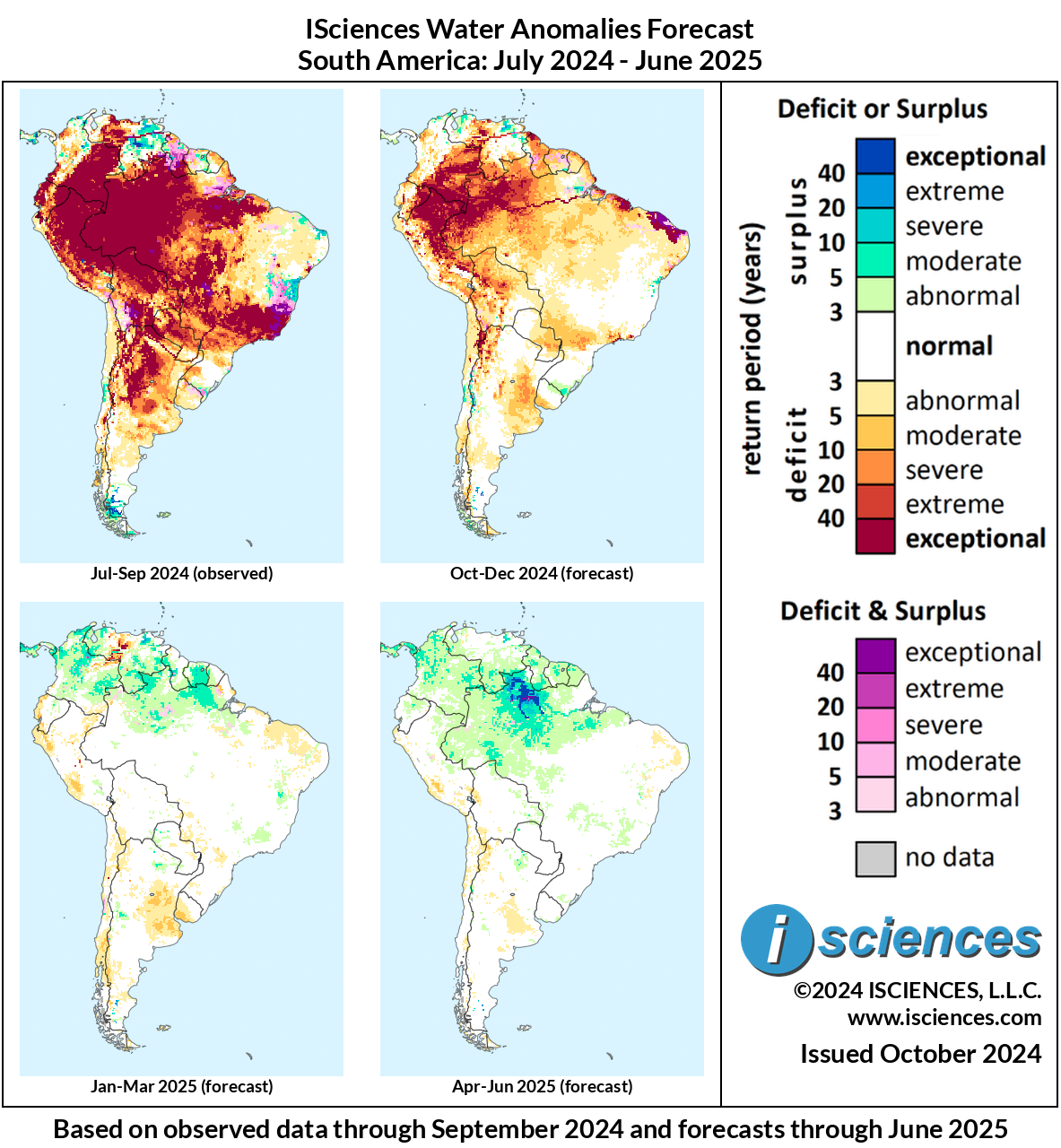 The forecast ending in June 2025 indicates that exceptional deficits widespread throughout South America will persist in the Amazon and in the Bolivarian Nations. Several coastal regions of Brazil will also experience exceptional deficits.