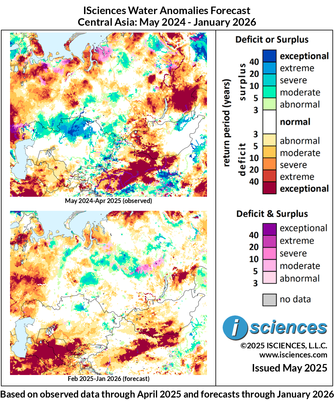 The forecast for the 12-month period ending in January 2026 indicates that exceptional deficits will persist in regions east of Lake Baikal, northern coastal Russia, and regions of Central Asia and European Russia. Surpluses are expected to continue in isolated portions of northern Kazakhstan and central Russia.