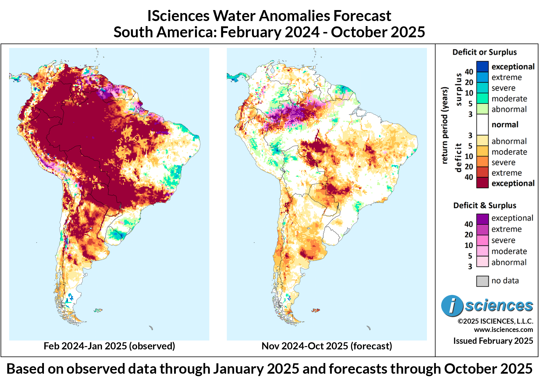From May through July 2025, widespread severe to exceptional surpluses in Amazonas are expected to downgrade in severity, becoming mostly moderate surpluses. These surpluses continue into eastern Colombia and in northeastern coastal regions of Venezuela, as well as northern Guyana. Severe to exceptional deficits may continue in central and south-central Brazil. Portions of the Guianas and Argentina’s Buenos Aires provinces are expected to observe moderate deficits.